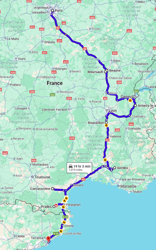 Route: Paris → Burgundy (Meursault & Beaune) → Annecy → Provence (Bonnieux & Luberon villages) → Prades → Barcelona